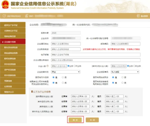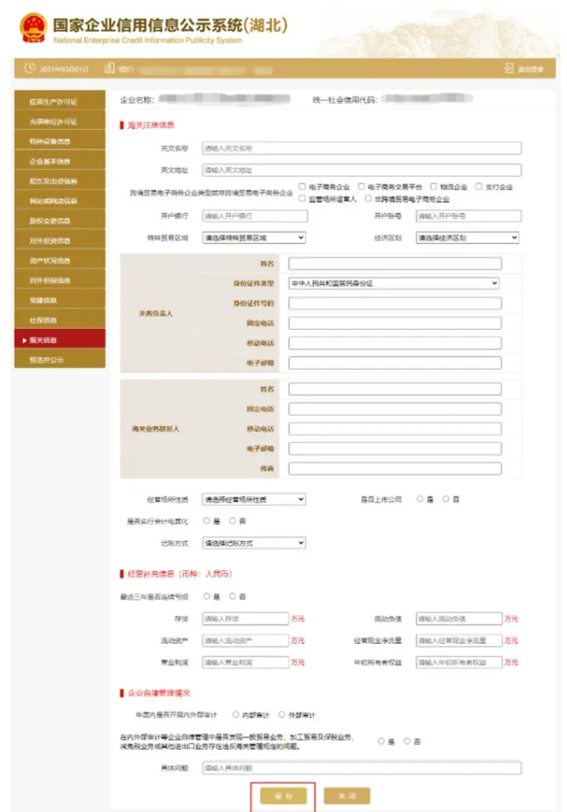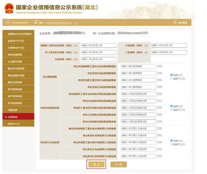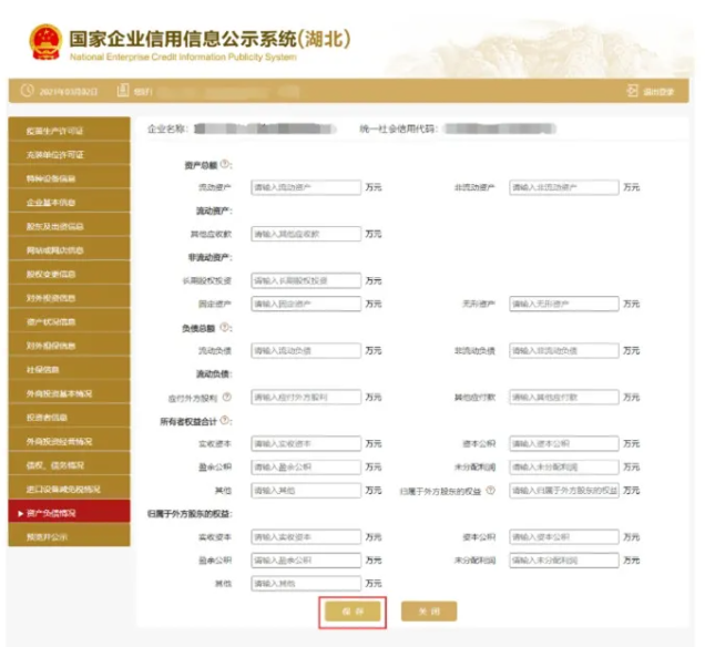 資產狀況信息 進入資產狀況信息頁面 填寫信息,點擊保存 企業自行選擇是否進行公示。