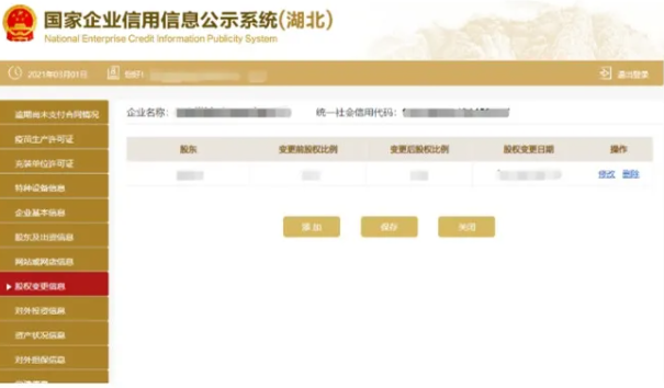 股東變更信息 進入股權變更頁面 可添加股權變更信息 也可刪除或者修改信息。